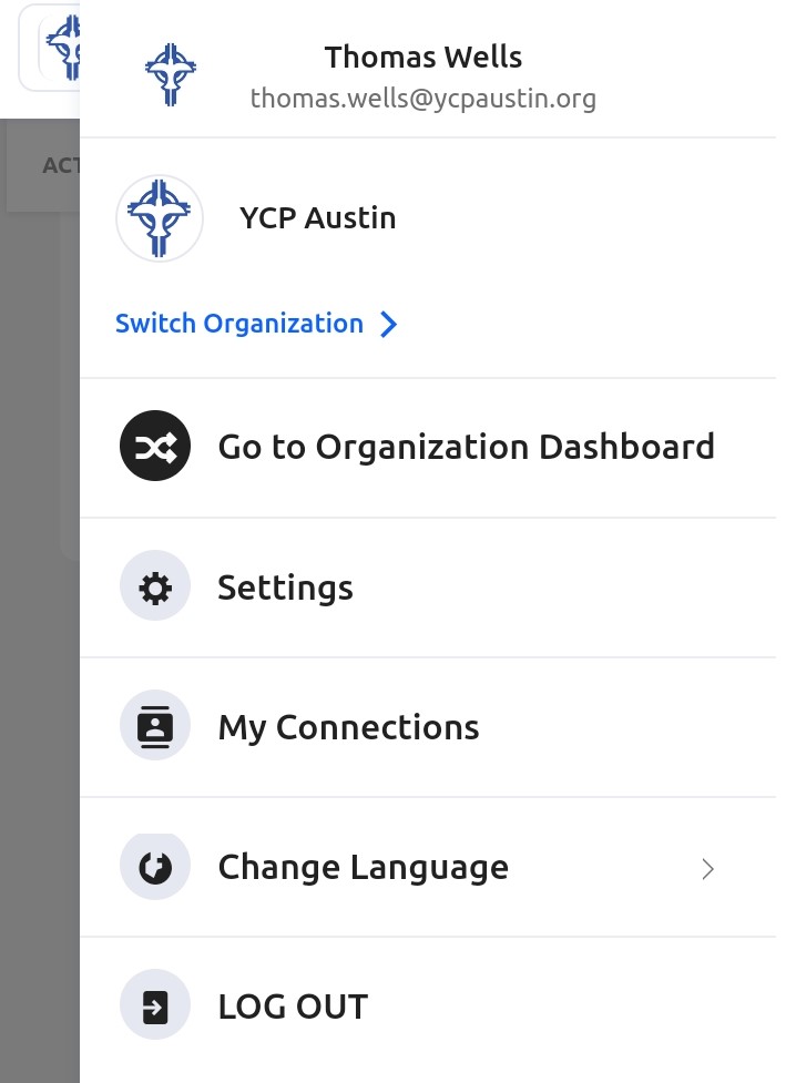 Due to the way GlueUp's database is programmed, all memberships originate from the national instance and then populate down to the chapter instances. When you are in your chapter's instance, ie YCP (Chapter Name), your current membership will not be visible and no memberships will be visible to purchase. To correct this, click your image or initial icon in the top-right corner, then click 'Switch Organization':