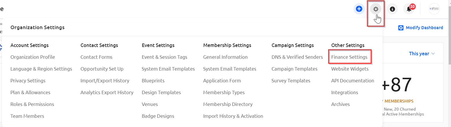Click on the Settings icon (the gear icon) and select "Finance Settings."