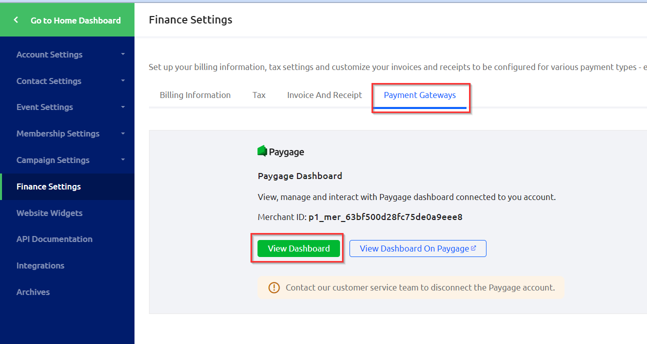 Click on the "Payment Gateways" tab to and click on "View Dashboard." Note, you can select "View Dashboard on Paygage," which will allow you to login to the Paygage platform itself rather than viewing from Glue Up.