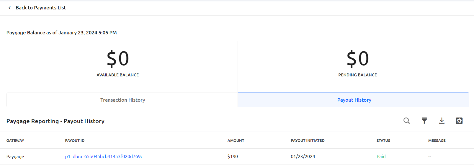 In Glue Up's Paygage Dashboard, you can see the payout history with the corresponding payout IDs. An available and pending balance will be listed as transactions take place. The full event revenue will be paid out in various amounts and intervals, rather than the total lump sum for your event revenue.