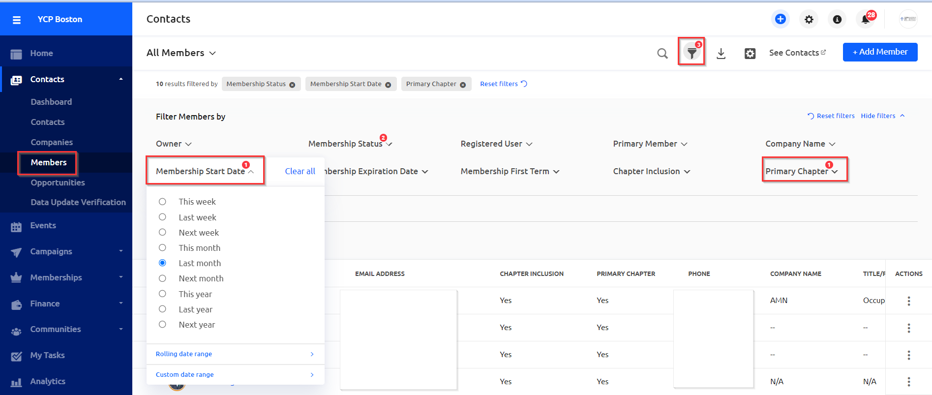 Click on "Members" under "Contacts" in the Chapter dashboard. Then click on the filter icon to customize the member report.