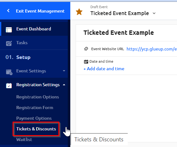 1) Navigate to "Tickets & Discounts" under the "Registration Settings" in the Event Management side bar.