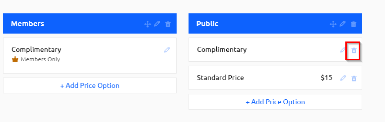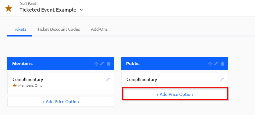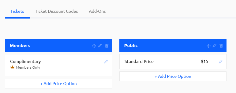 2) Depending on the blueprint template you selected for your event, there may be default ticket settings already set up. In this example, any non-members will be charged $15 a ticket to attend the event, and members will be complimentary, free-of- charge. Click on "+Add Price Options."