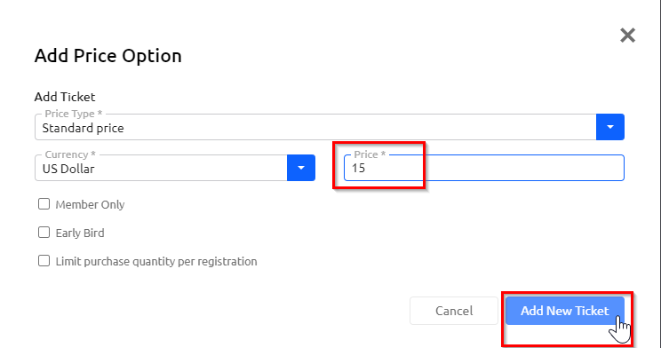 3) In the pop-up window, add the ticket price of your choice and click "Add New Ticket."