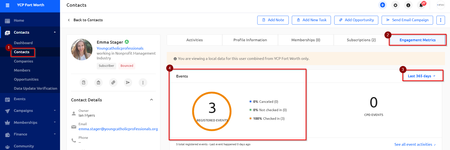 3) Additionally, you can look up historical event attendance for a member or contact under their profile (1). Under the "Engagement Metrics" tab (2) , change the date range (3) and view the number of events they have participated in (4).