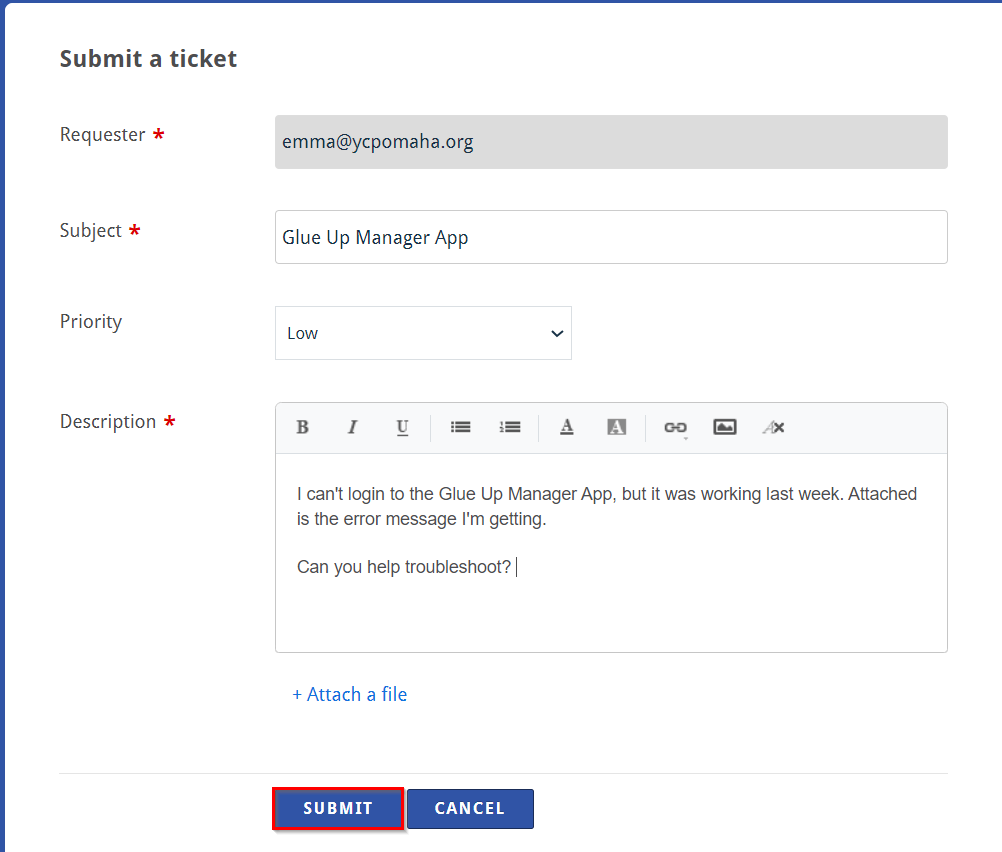 - Attach a file: Use this feature to add a screenshot of an error or any file that will help us understand your issue and best offer our support