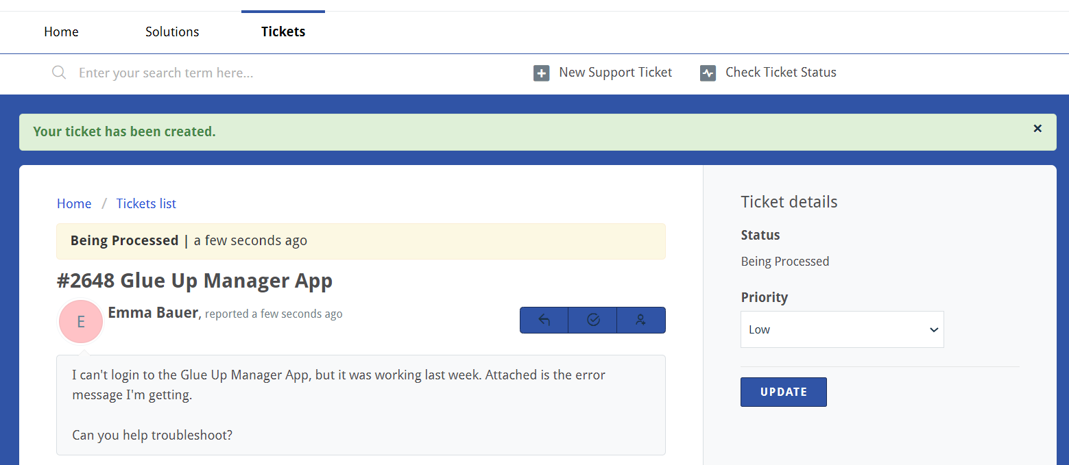 3) You will see a confirmation message that your ticket has been created successfully and you'll see initial information about it's processing.